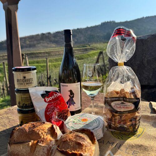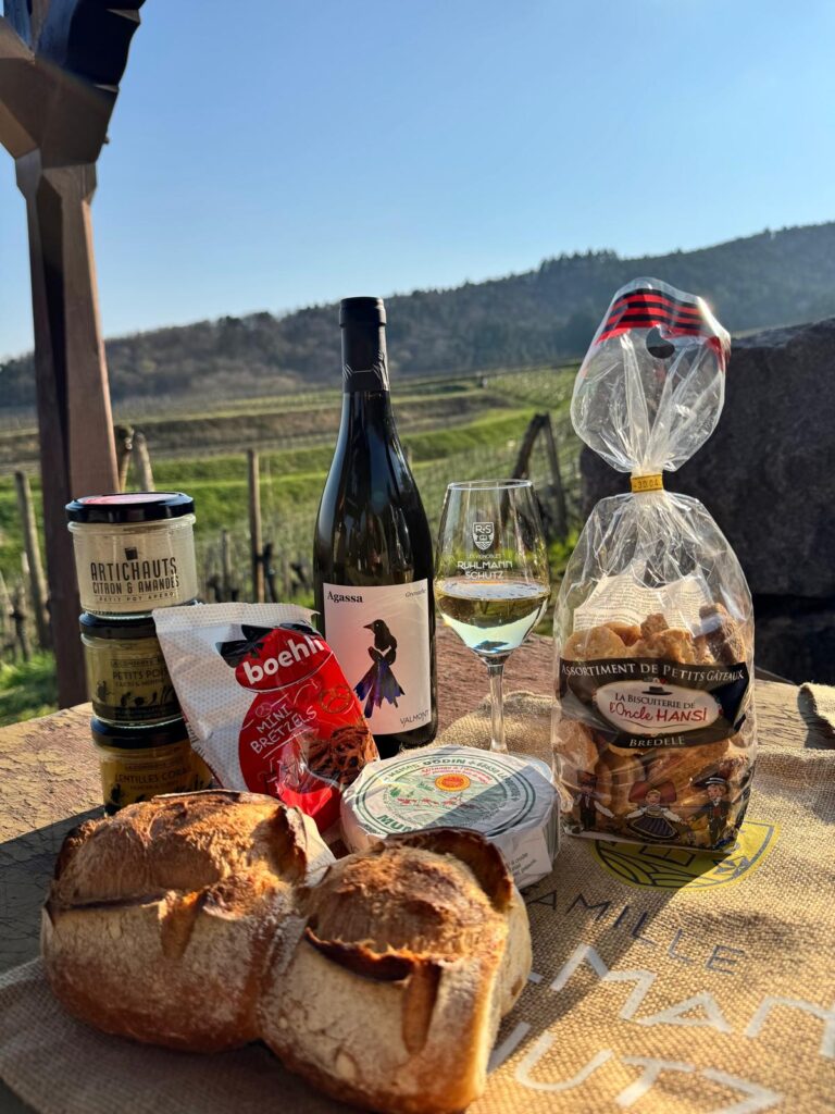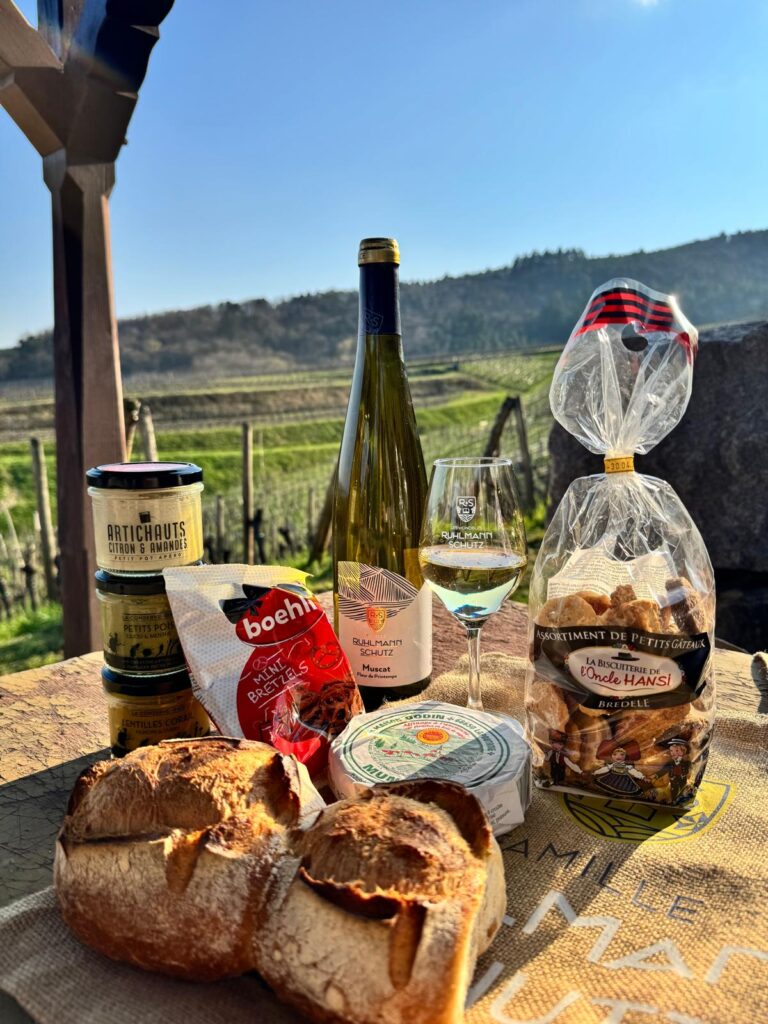 Munis de votre plan, laissez-vous guider à travers les vignes jusqu’à notre maisonnette, où vous pourrez faire une pause gourmande avec une vue imprenable sur le paysage alsacien 🌄